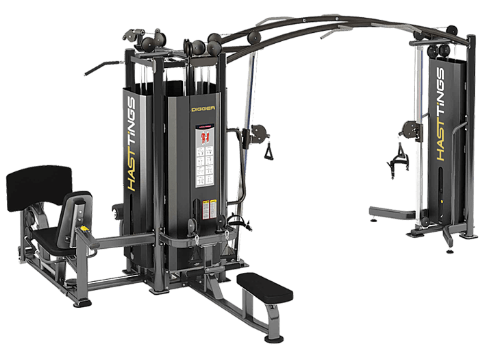 5-ти позиционная мультистанция HASTTINGS Digger позволяет качественно прорабатывать мышцы всего тела. Тренажер включает в себя станцию для тяги сверху, станцию для гребной тяги, станцию для жима ногами и две кабельные колонны, что позволяет одновременно заниматься на тренажере до пяти пользователей.