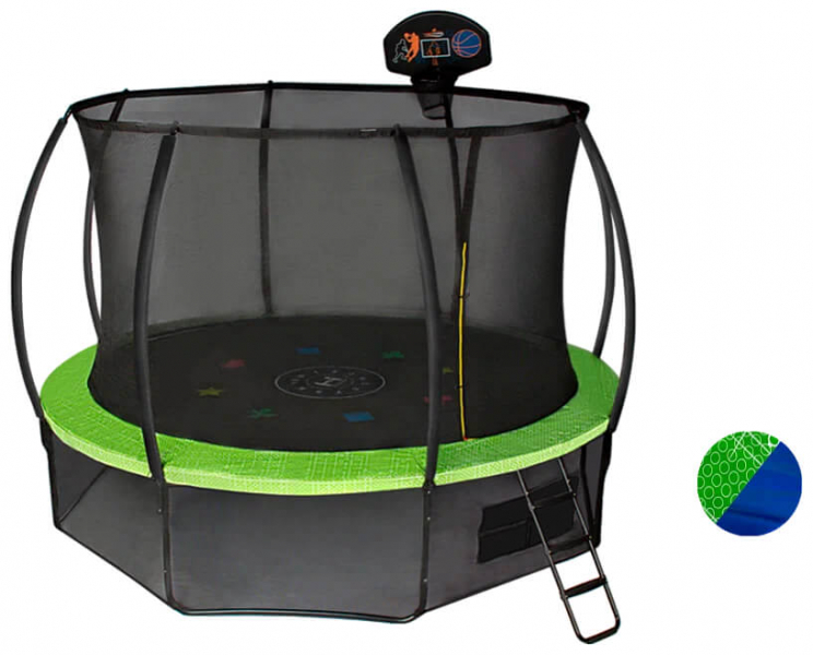 - Комплектация рамная конструкция, защитный мат, защитная сетка, нижняя защитная сетка, лестница, баскетбольное кольцо, мяч, насос