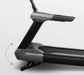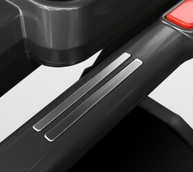 - Дополнительно Антискользяцие алюминиевые площадки для ног справа и слева от бегового полотна, эргономичные поручни с датчиками пульса, увеличенные боковые поручни, покрывающие большую часть беговой поверхности, два больших отсека для бутылки с водой и принадлежностей