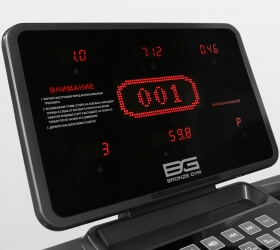 - Показания консоли Программный анимированный профиль, время, скорость, дистанция, расход калорий, шаги, пульс, угол наклона, текущая программа