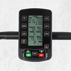 Отображает 7 показателей тренировки и имеет 6 кнопок быстрого доступа к целевым программам.