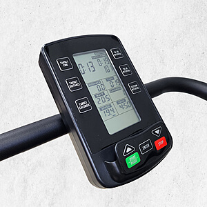 Отображает 7 показателей тренировки и имеет 6 кнопок быстрого доступа к целевым программам.