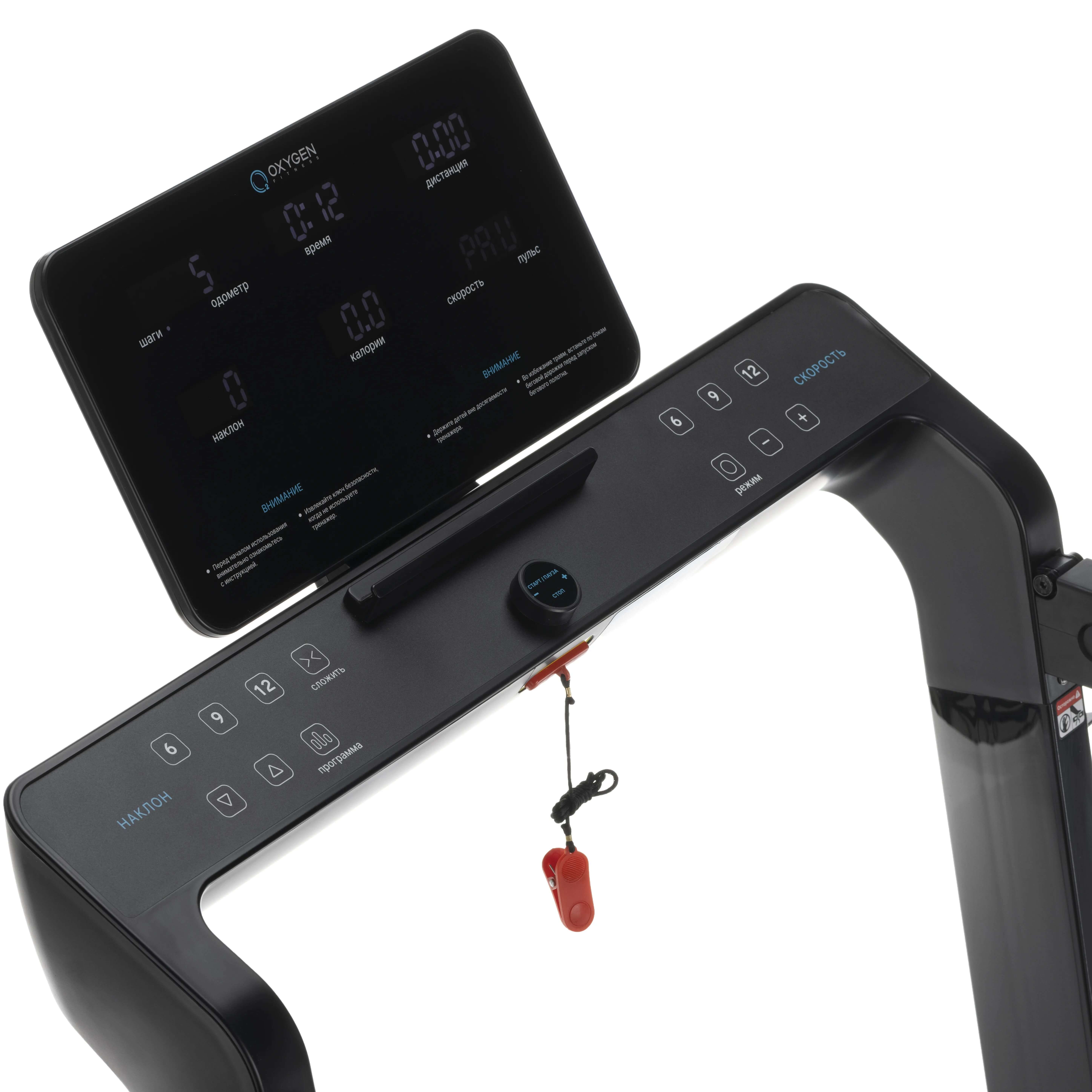 - Показания консоли время, скорость, дистанция, уровень наклона, калории, пульс, шаги, жироанализатор (Body-Fat), профиль программы, статус Bluetooth