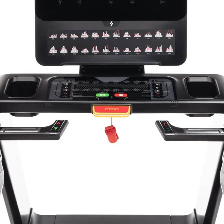 Модель выполнена в строгом, но современном стиле, сочетающем чёрные и серые оттенки с тонкими акцентами красного цвета, что подчеркивает её премиальность и профессиональный характер. Обтекаемые формы корпуса придают дорожке динамичный и энергичный облик, а продуманные детали, такие как сигнальные огни, расположенные вдоль внешнего корпуса и по бокам бегового полотна, создают эффектное визуальное сопровождение во время работы тренажера. Эти огни не только придают модели футуристичный вид, но и выполняют практическую функцию, сигнализируя о том, что дорожка находится в рабочем режиме.