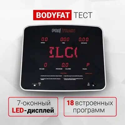 7-оконный LED-дисплей отображает основные показатели тренировки. Консоль включает 18 встроенных программ, в том числе 3 пользовательские и Bodyfat-тест (жироанализатор).