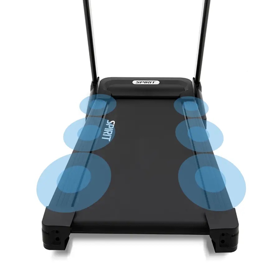 - Амортизация бегового полотна, состоящая из 8 полиуретановых эластомеров, эффективно поглощает ударную нагрузку, снижая риск возникновения травмы;