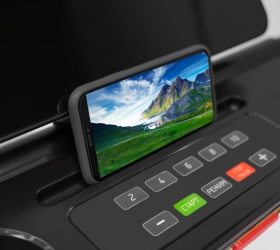 Бортовой компьютер представляет собой LED дисплей с белой индикацией, на который выводятся все основные параметры тренировки - время, скорость, дистанция, калории, пульс, жироанализатор (Body Fat). В памяти консоли содержится 14 предустановленных программ, направленных на достижение различных спортивных целей, среди которых: быстрый старт, целевые программы обратного отсчета по времени, дистанции, расходу калорий, 9 предустановленных программ, жироанализатор. Для считывания показаний пульса в поручни дорожки вмонтированы контактные сенсорные датчики. Разнообразить тренировку поможет возможность для подключения тренажера к популярным коучинговым приложениям FITSHOW, ZWIFT и KINOMAP через смартфон по Bluetooth.