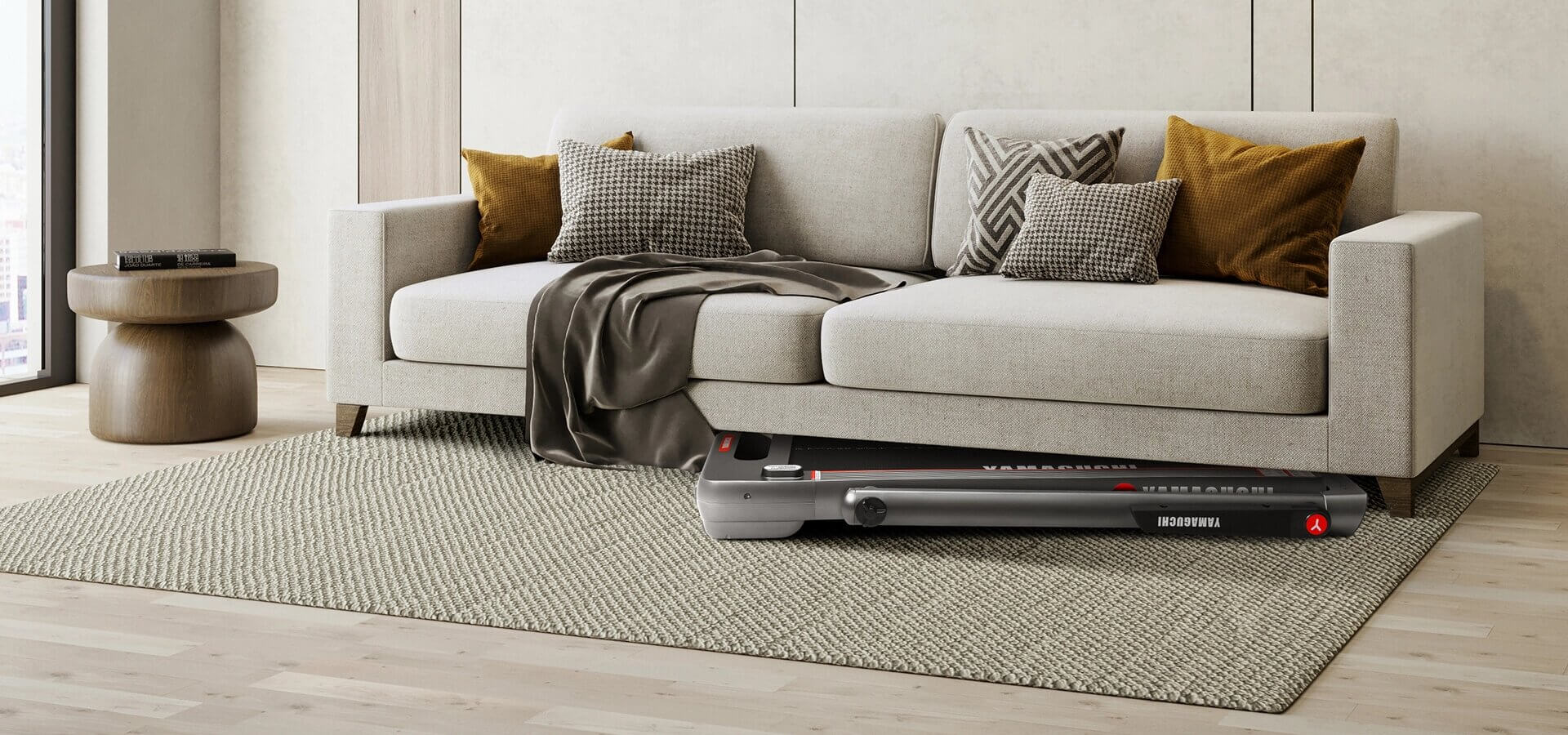 Беговая дорожка легко спрячется под диван или встанет вплотную к стене — достаточно только сложить поручень. Позволяет сложить беговую дорожку до толщины 15 см и сэкономить пространство в помещении.