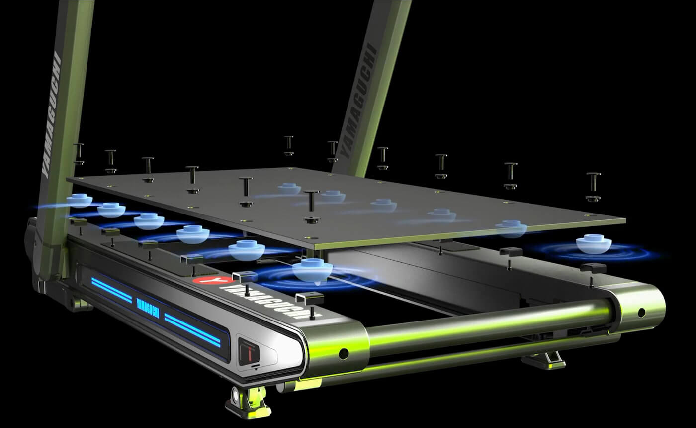 За поглощение вибраций и толчков при каждом шаге отвечает PRO-SAFE Protection System, представляющая собой крепление деки беговой дорожки к раме из алюминиевого сплава ADC12 при помощи 12 амортизирующих демпферов специальной формы.