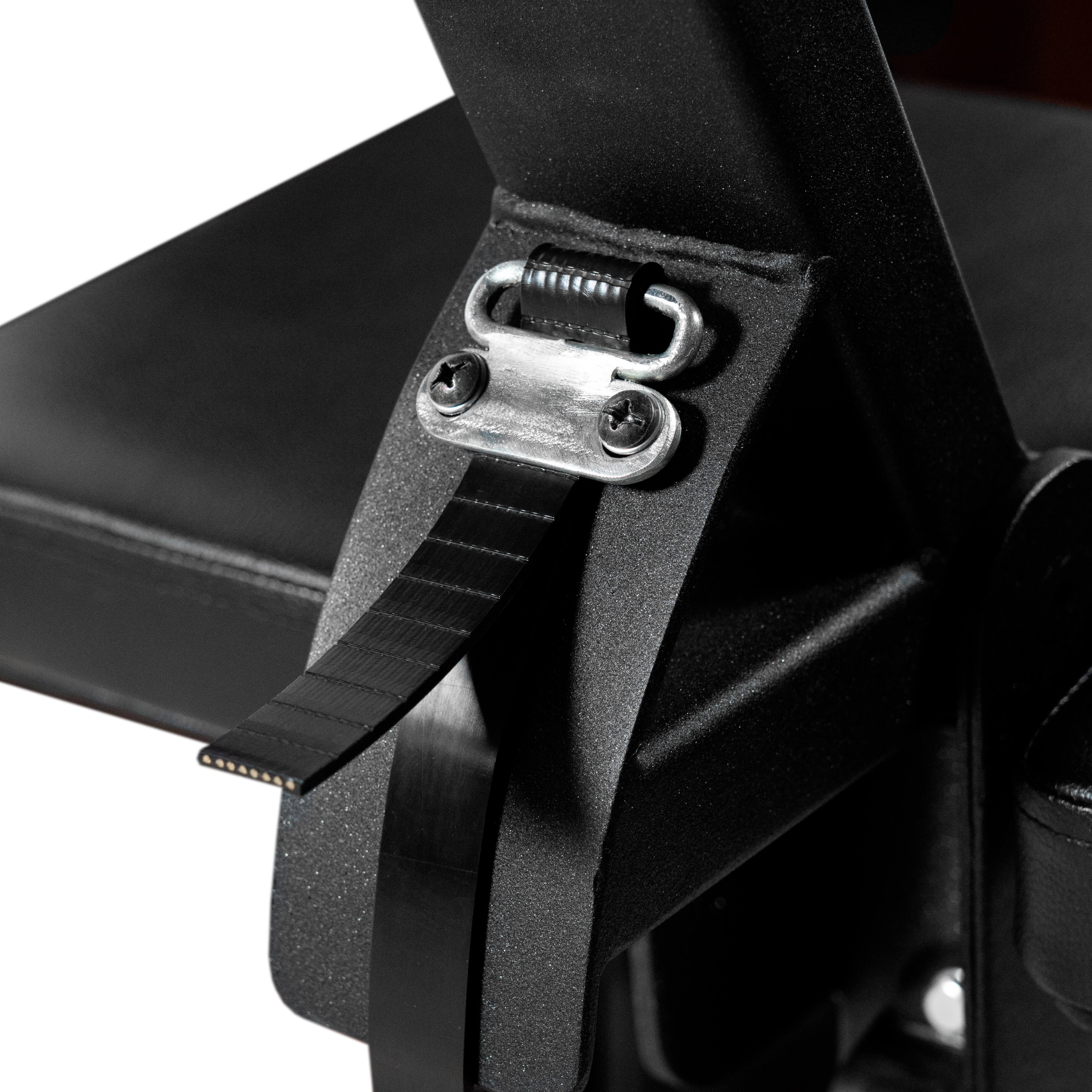 Одним из ключевых элементов является ремень размером 25*3 мм, который структурирован 8 высокопрочными нитями из синтетического материала. Этот ремень обеспечивает долговечность и износостойкость, обладает высокой прочностью на разрыв и жесткостью осевого вектора нагрузки. Благодаря этим характеристикам ремень не растягивается во время срыва веса и смены его направления в конечных точках фаз амплитуды движения, что гарантирует стабильность и эффективность тренировок.