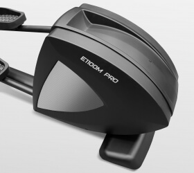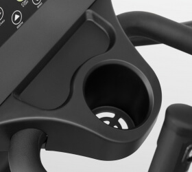 Из дополнительных опций стоит отметить наличие сенсорных датчиков измерения пульса на фиксированных поручнях, а также быстрых клавиш регулировки нагрузки. Для бутылки с водой и личных аксессуаров установлен специальный увеличенный отсек на передней стойке тренажера. Переместить E1100M можно благодаря 2-м транспортировочным роликам.