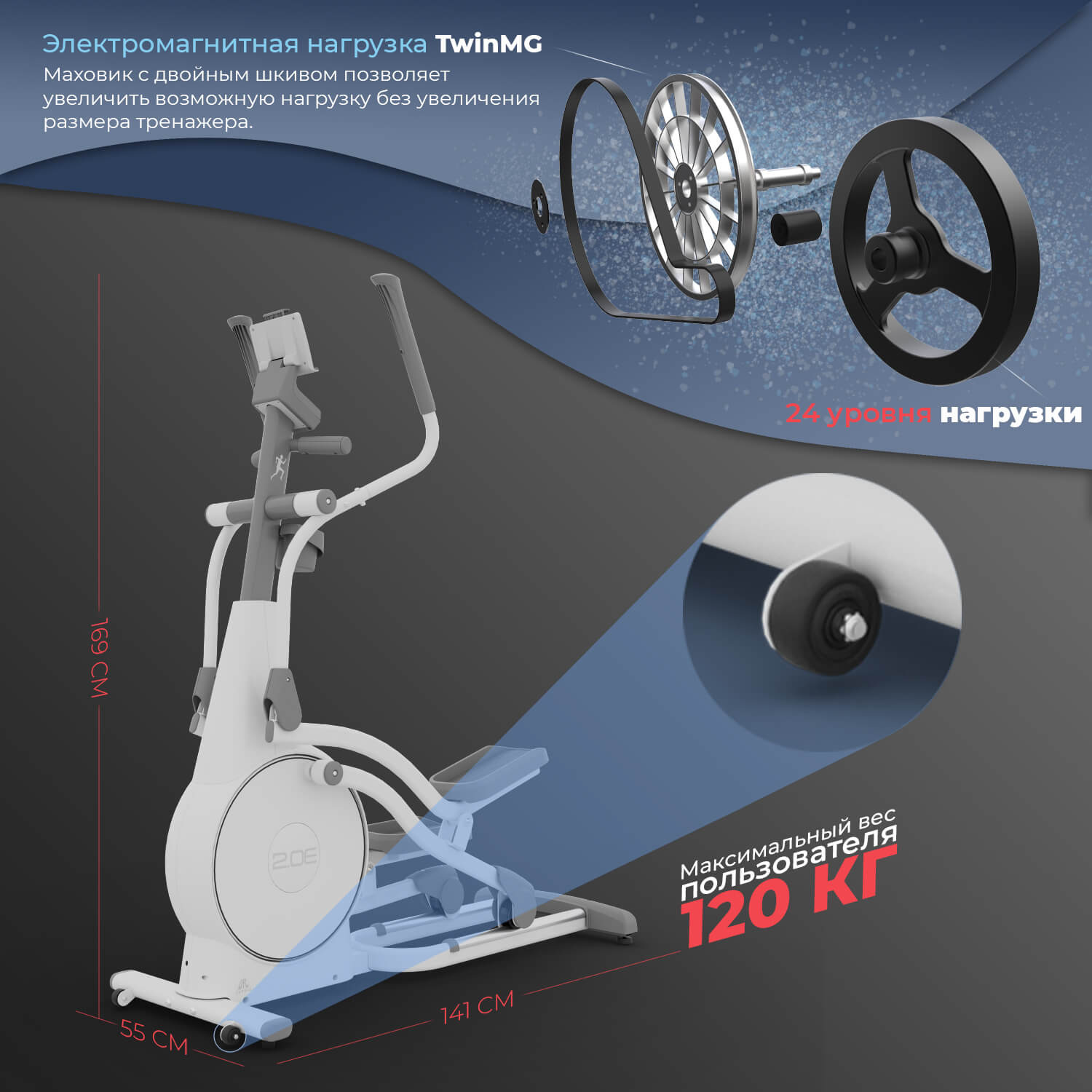 Эллипсоид выдерживает вес пользователя до 120 кг, сохраняя при этом компактные габариты. Тренажер оснащен транспортировочными роликами, благодаря которым его легко переместить в любое место в комнате после завершения треннировки.