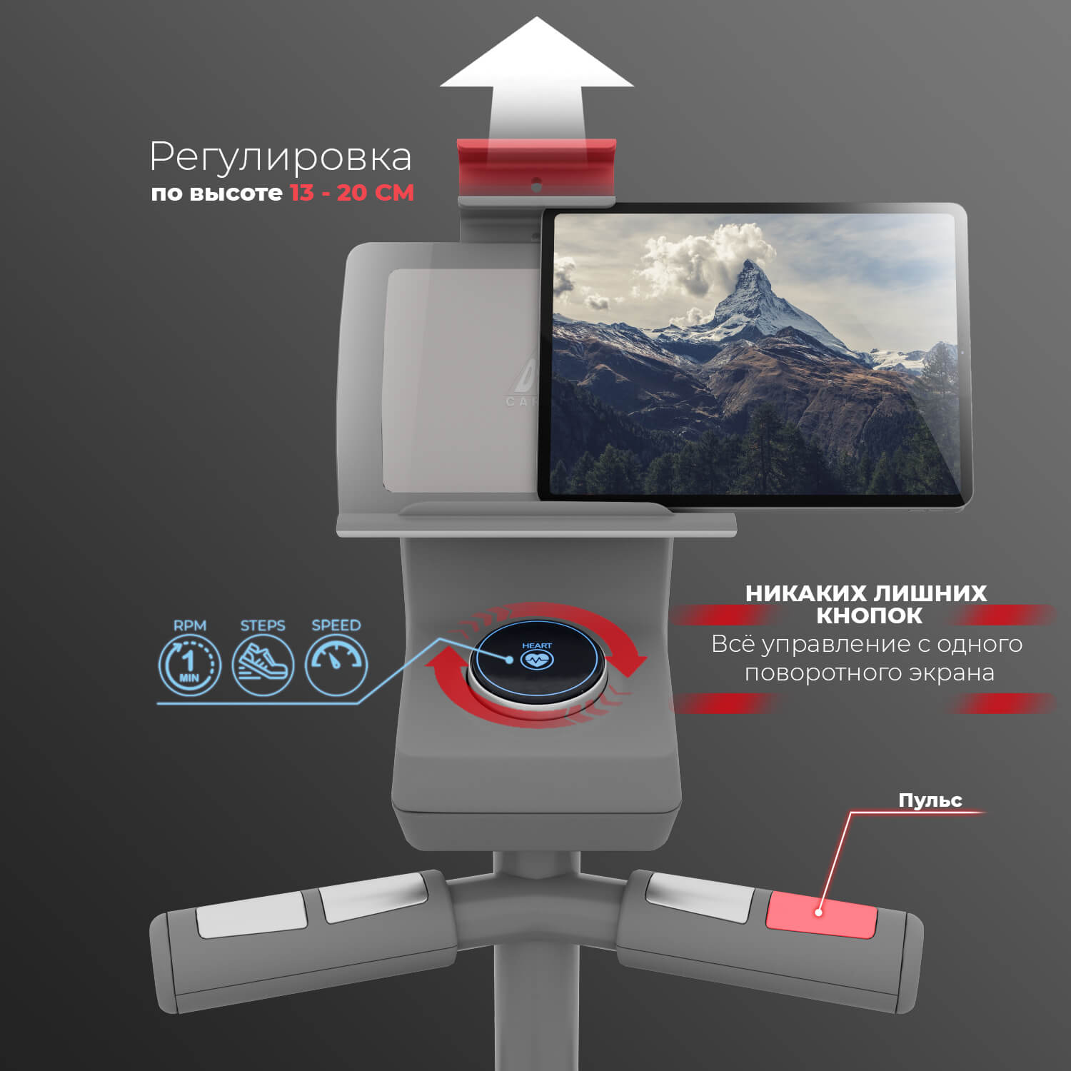 Все управление осуществляется с помощью круглого экрана. Поворот экрана по часовой или против часовой стрелки позволяет управлять функциями тренажера. На передней консоли расположены регулируемая подставка под планшет (от 13 до 20 см)
