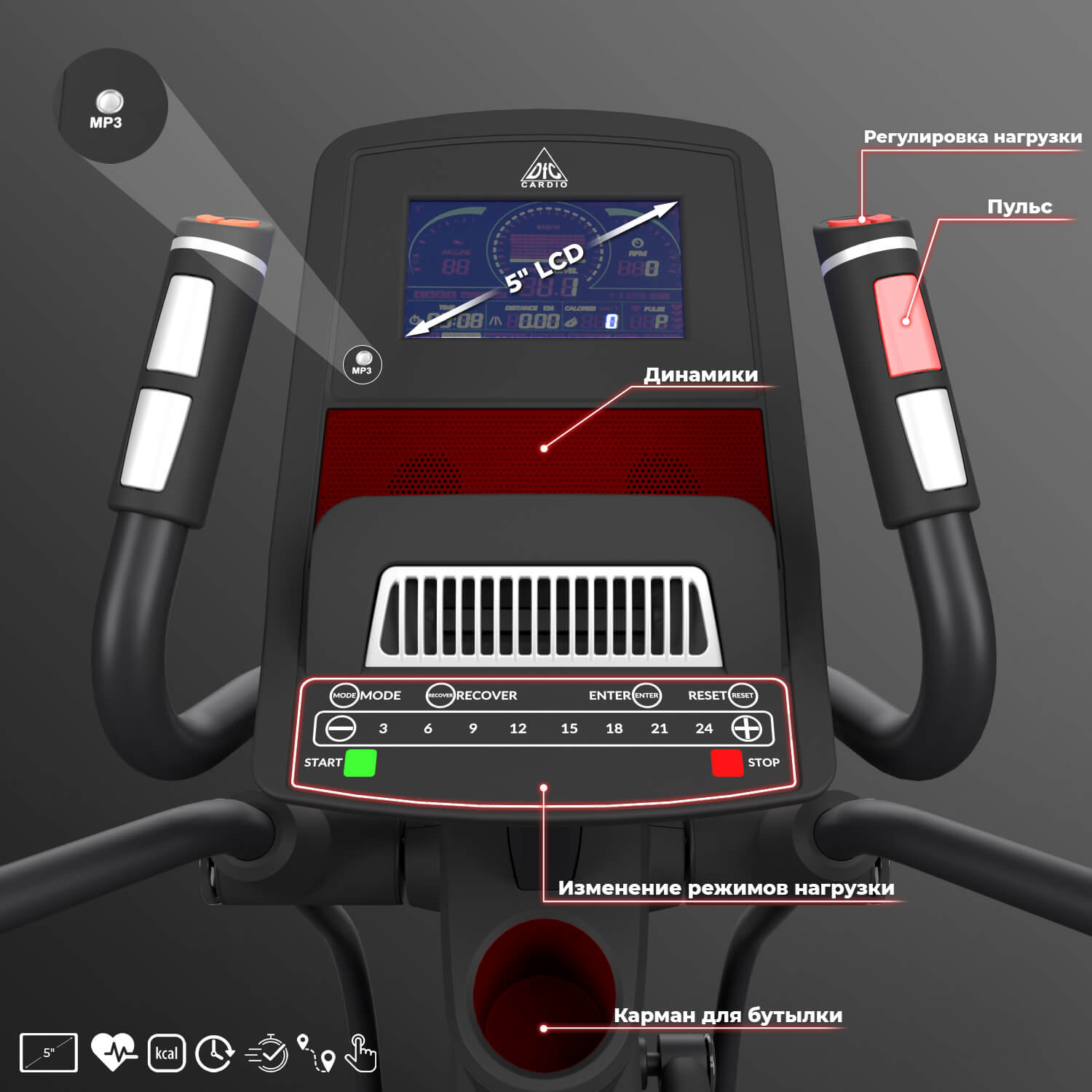 Эллипсоид оснащен 5-дюймовым LCD монитором, на котором отображаются данные тренировки: пульс, калории, расстояние, время занятия, скорость. Можно использовать ручной режим или выбрать одну из 12 предустановленных программ. Слушайте музыку, просматривайте видео со своего гаджета во время тренировок: тренажер оснащен 2-мя динамиками и разъемом MP3.