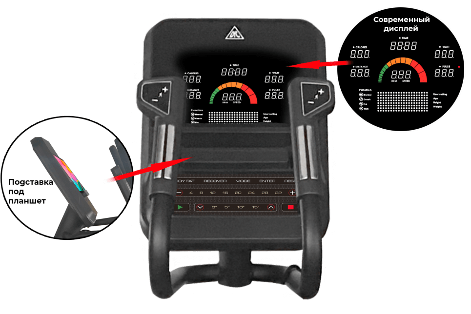 Для занятия можно выбрать одну из 12 встроенных программ тренировок, каждая из которых адаптирована под определенные требования. Большой цветной дисплей отображает основные показатели: скорость, дистанцию, уровень сложности, время занятия, расстояние, количество сожженных калорий, пульс. Датчики пульса расположены на поручнях. MP3 и USB вход позволяют прослушивать музыку во время тренировки.