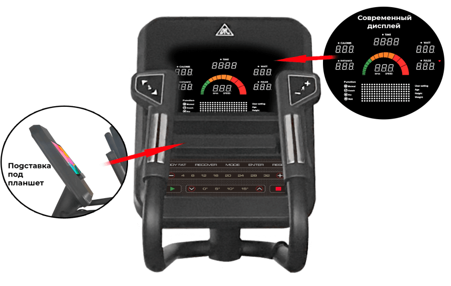 Имеется 12 предустановленных программ для тренировок. Уникальный цветной дисплей — такой практически не встретить среди других аналогов. На нем отображаются: время занятия, скорость, уровень сложности, расстояние, затраченные калории, пульс, который считывается с датчиков на поручнях. Имеются MP3 и USB входы на передней консоли, а также подставки под планшет и бутылку.