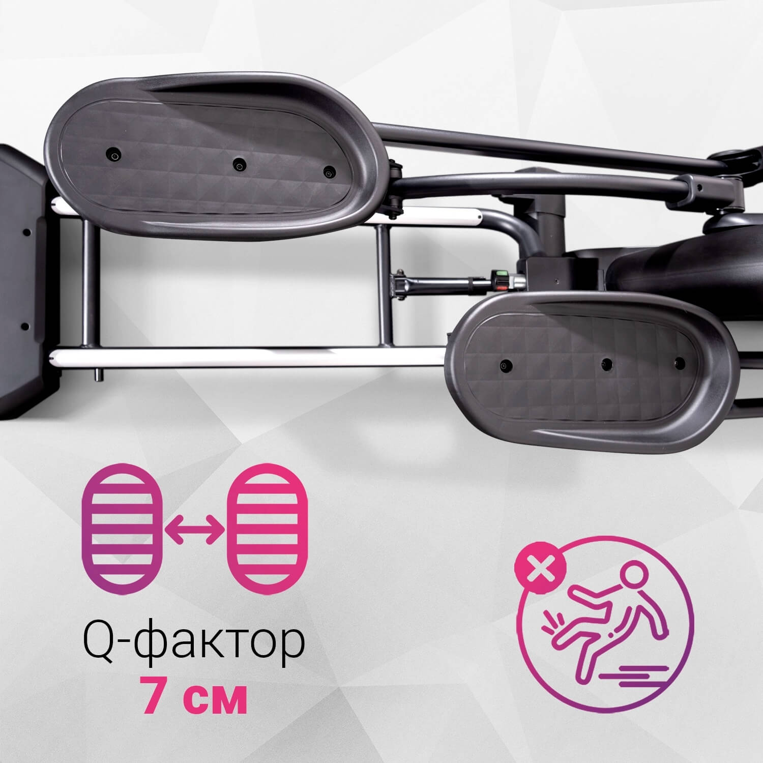 Широкие педали с прорезиненной поверхностью надежно фиксируют стопу и позволяют полностью сконцентрироваться на тренировке. Q-фактор всего 7 см.