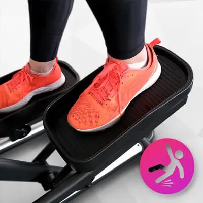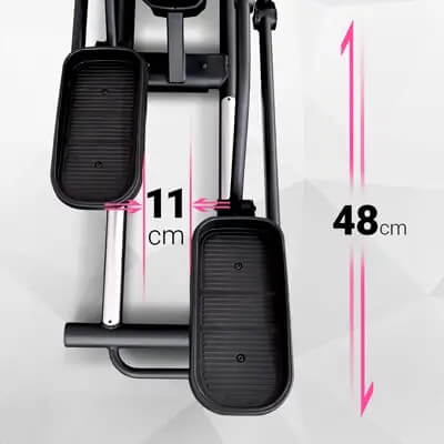 Длина шага 48 см и Q-фактор всего 11 см позволяют тренироваться с правильной биомеханикой. Тренажер имитирует естественные движения, уменьшая нагрузку на суставы и позвоночник.