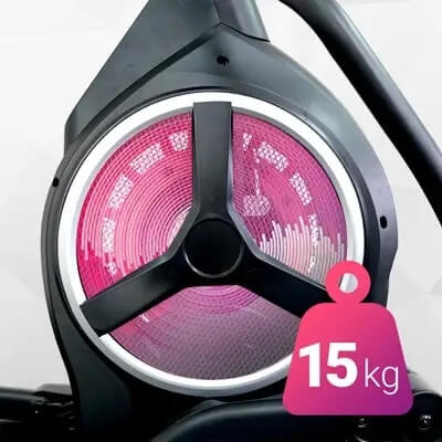 Инерционная масса маховика — 15 кг. Благодаря этому тренажер работает бесшумно, а движения на нем плавные и поступательные, без рывков.