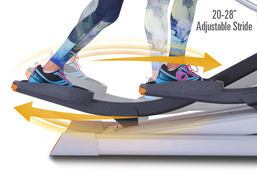 Это эксклюзивная функция Octane Fitness которая автоматически регулирует длину шага, для имитации естественного шага или бега. Он имитирует те движения которые вы выполняете естественно: когда идете, у вас короткий шаг, а когда начинаете бежать, ваш шаг автоматически удлиняется. Это не только комфортно, но и добавляет разнообразие к тренировкам. Регулировка длины шага составляет от 51 до 71 сантиметра, поэтому тренажер удобно подходит любому пользователю.