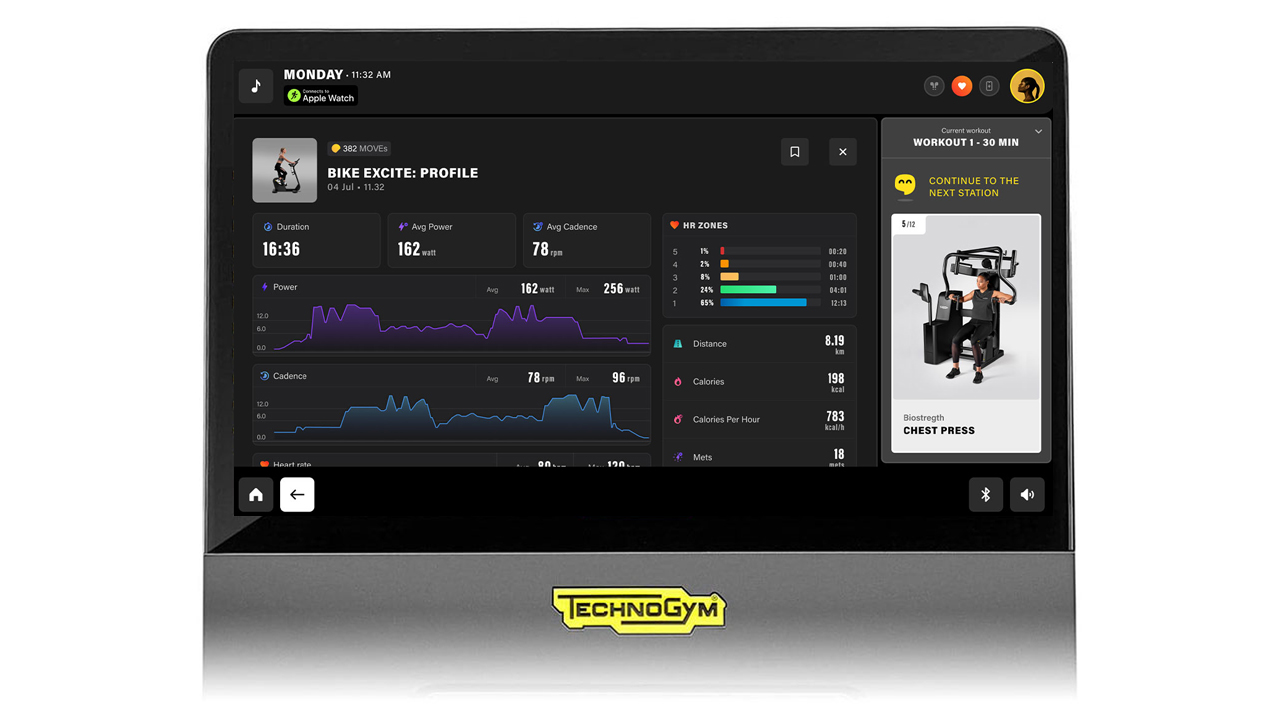 Бесконтактное сопряжение Apple Watch с консолью обеспечивает мгновенную связь с приложением Technogym Live. Следите за пульсом в реальном времени прямо на дисплее тренажёра; результаты автоматически синхронизируются с Apple Health после завершения тренировки.