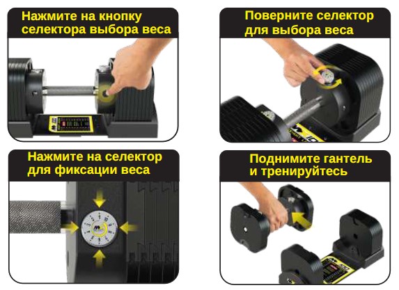 Благодаря механизму регулировки веса от 4,5 до 45 кг гантель заменяет целый стойку классических пар. Плавное изменение нагрузки происходит одним поворотом рукояти — без рывков, без шума, без необходимости перекладывать блины.