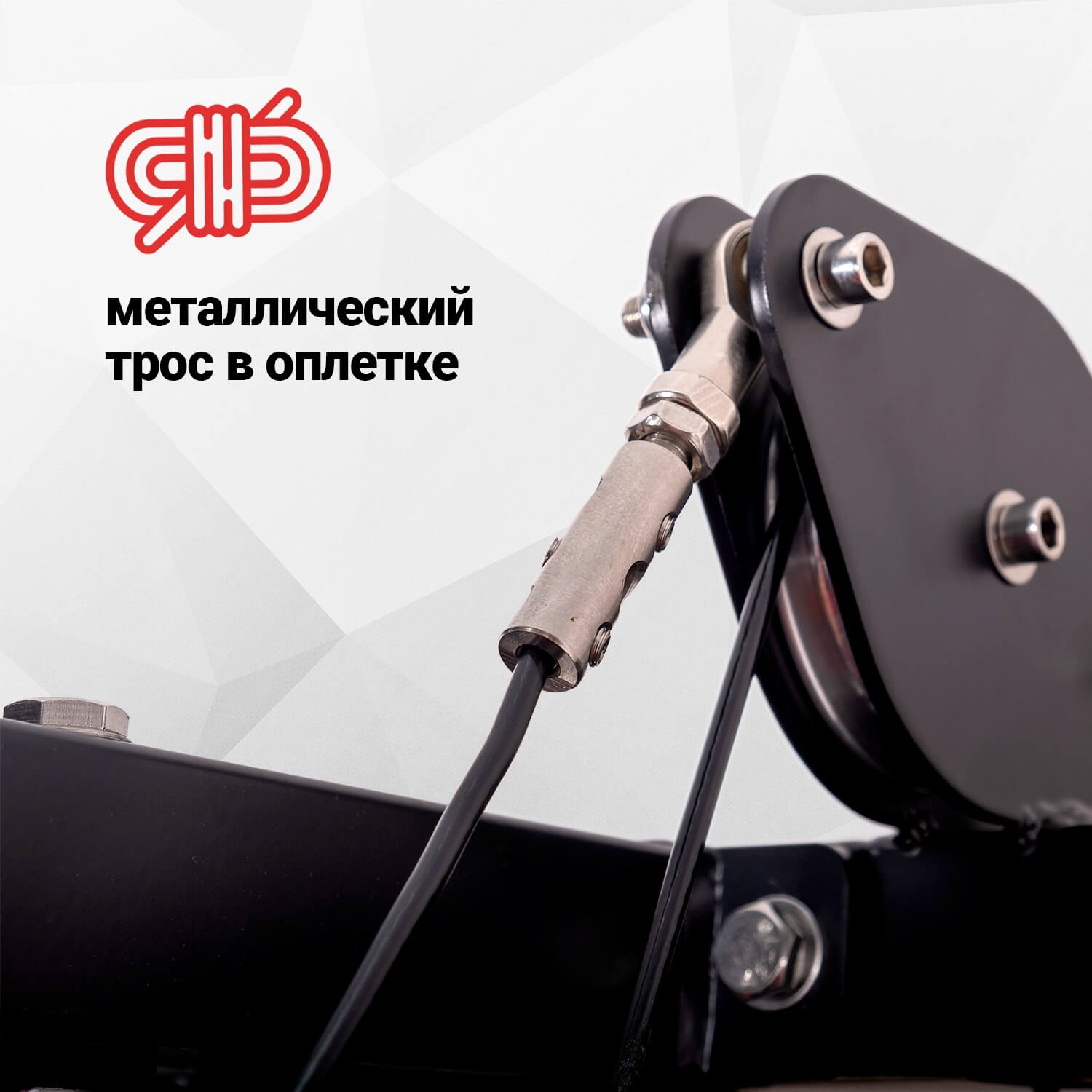 Металлический трос в оплетке, что защищает его от повреждений и увеличивает срок службы. Прочность на разрыв — более 500 кг.
