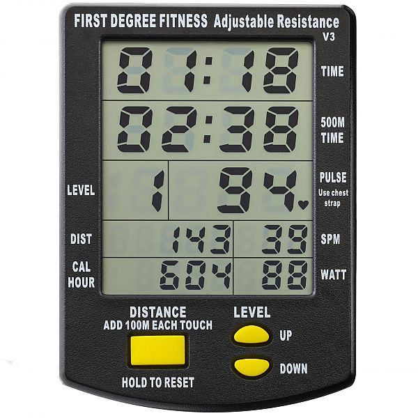 FluidRower Apollo Plus Black оснащен многофункциональным монитором, который позволяет отслеживать ключевые показатели тренировки. На дисплее отображаются: время тренировки, количество гребков в минуту (SPM), общее количество гребков, пройденное расстояние, сожженные калории и мощность в ваттах.