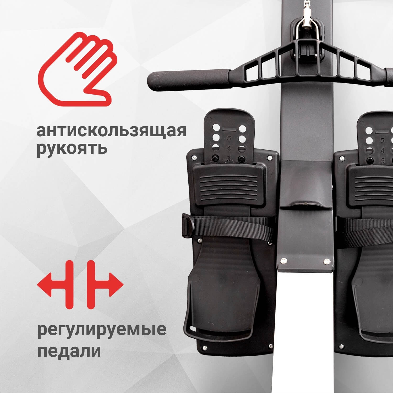 Антискользящая рукоять длиной 50 см для правильного и надежного хвата. Регулируемые широкие педали с ремешками, расстояние между шаговыми пластинами - 10 см для комфортных и безопасных тренировок.