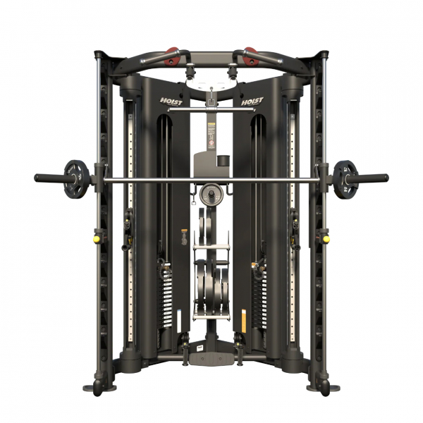 HOIST H-8 — это полнофункциональный тренировочный центр в компактном корпусе, созданный для максимально эффективных тренировок. Конструкция сочетает систему регулируемых колонн EZG, встроенный Смит-тренажер, станции для тяги снизу и сверху, а также встроенное место для хранения аксессуаров и дисков.