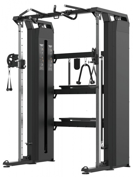 Данный кроссовер относится к моделям профессионального класса и предназначен для коммерческого использования. Функциональные упражнения, выполняемые с помощью этого тренажера, обеспечивают эффективную проработку различных мышечных групп. Двойные тяговые колонны позволяют выполнять упражнения как двумя руками, так и одной, что обеспечивает возможность прорабатывать необходимые группы мышц. Вращающиеся рукояти обеспечивают свободные и естественные движения. На верхней перекладине предусмотрен турник, рукоятки которого позволяют выполнять подтягивания Широким, нейтральным и узким хватом, что позволяет прорабатывать различные группы мышц, акцентируя на них нагрузку. Конструкция кроссовера включает 2 грузовых стека. Удобный выбор нагрузки осуществляется с помощью штифтов.