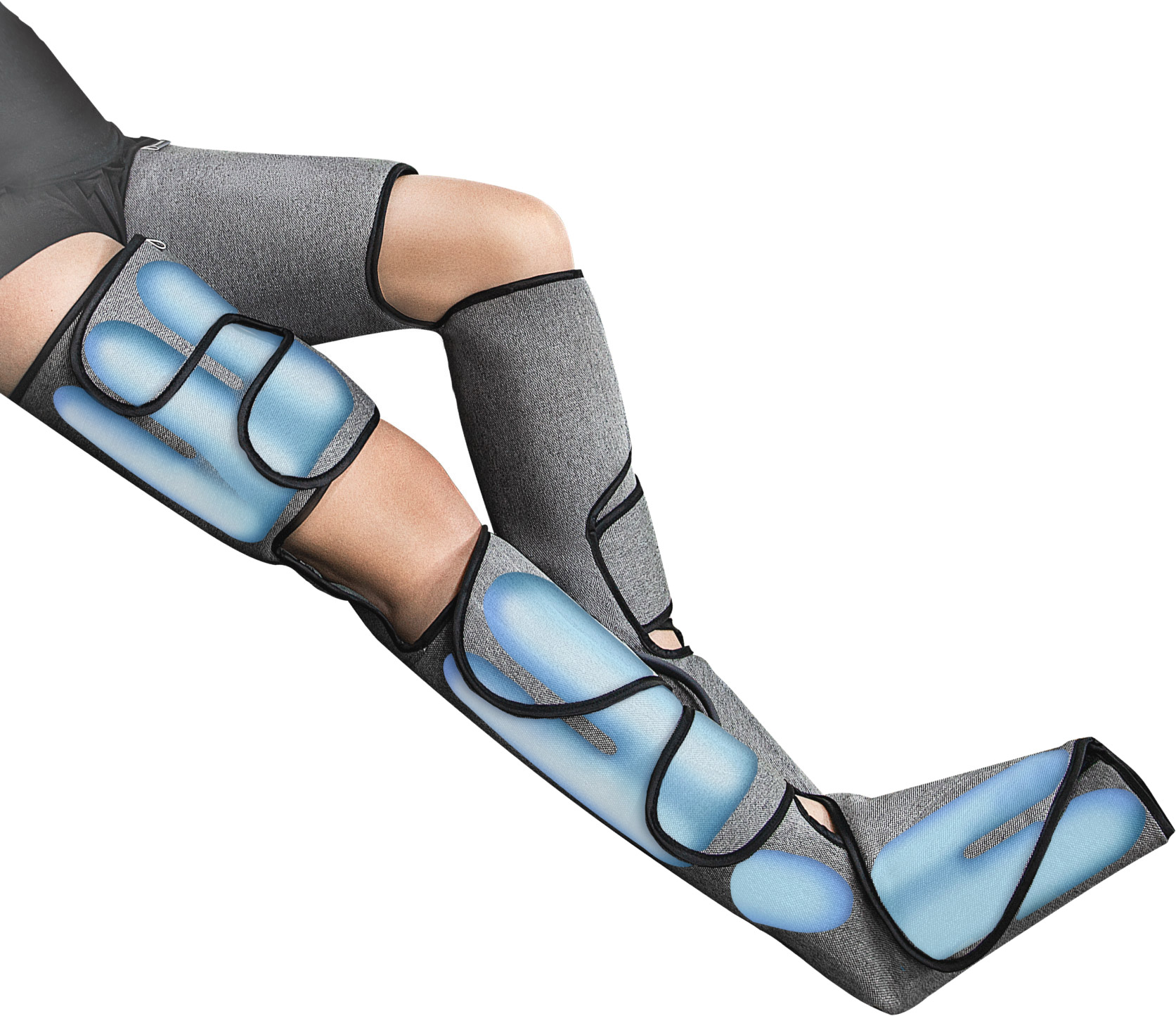 Аэродинамическое действие Air Boots Max с попеременным сжатием компрессионных подушек и разной степенью интенсивности выполняет «выжимающий» массаж ноги.