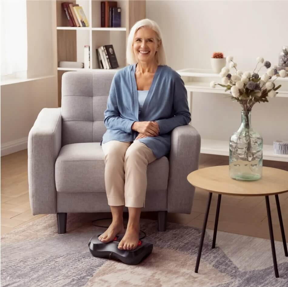 Движение дисков под разным углом вращения позволяет тщательно проработать всю поверхность стопы, снять усталость и отечность ног.