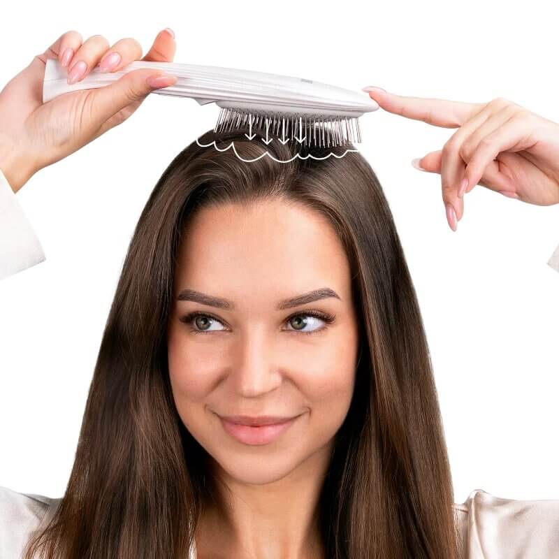 Расческа имеет 160 иголочек, воздействие которых к определенному участку головы, помогает не только удалить омертвевшие клетки кожи и перхоть, но ещё затронуть точки давления, которые используются для роста волос.