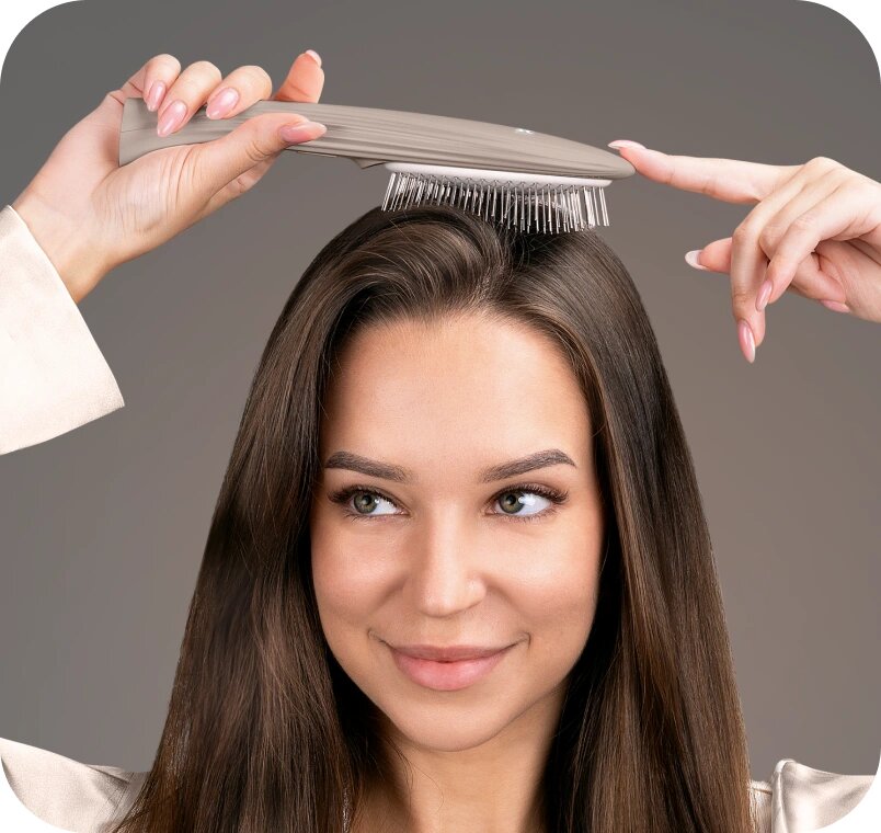 Вибрации стимулируют фолликулы изнутри, ускоряя рост волос в длину и толщину. Массаж снимает стресс, усиливает питание корней и улучшает качество волос.