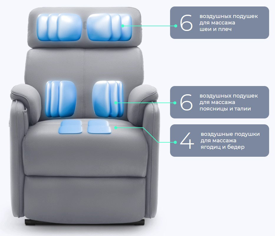 16 воздушных подушек 2D Push Air имитируют различные массажные приемы, тем самым обеспечивая интенсивный аэрокомпрессионный массаж шеи, плеч, спины, талии, поясницы и бедер.