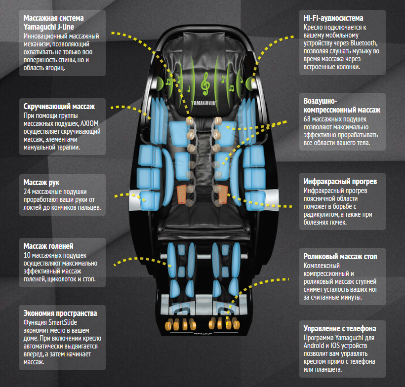 Приложение YAMAGUCHI для телефонов и планшетов на базе IOS и Android добавит удобства в управлении креслом. К креслу можно подключиться посредством технологии Bluetooth и управлять даже на расстоянии. Приложение также доступно на русском языке.