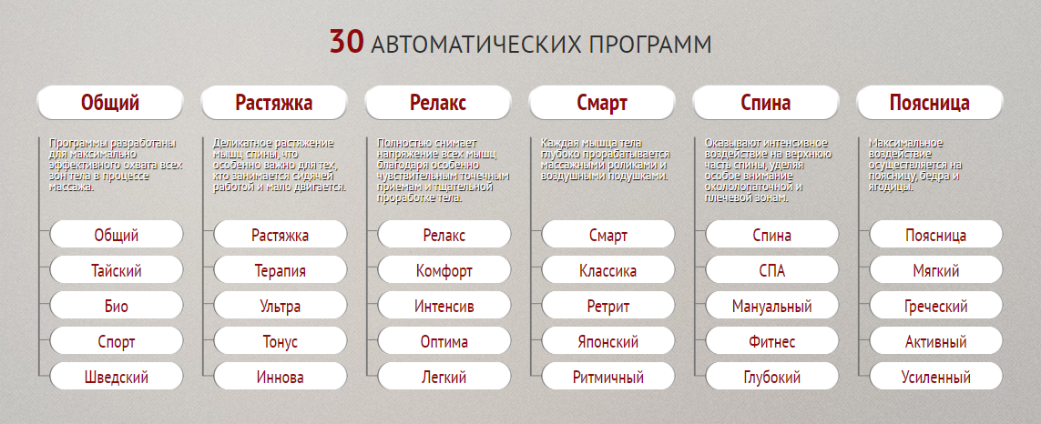 - Настройка интенсивности воздушных подушек 15 режимов