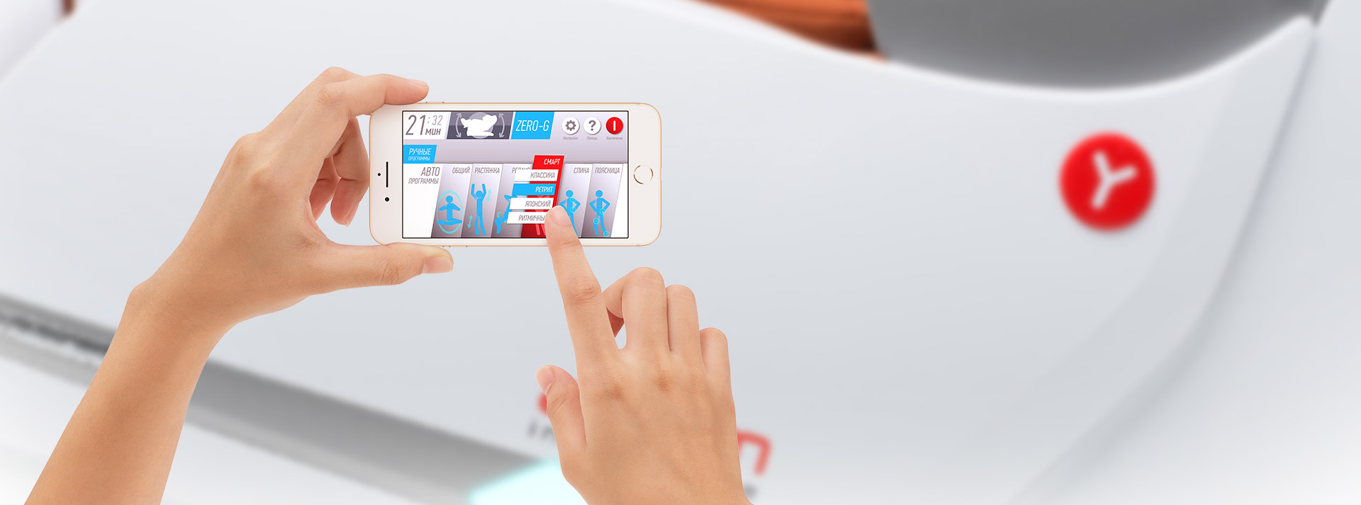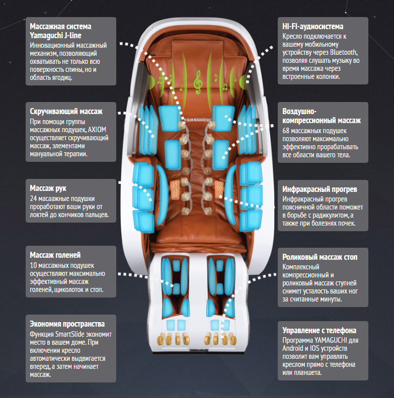 Приложение YAMAGUCHI для телефонов и планшетов на базе IOS и Android добавит удобства в управлении креслом. К креслу можно подключиться посредством технологии Bluetooth и управлять даже на расстоянии. Приложение также доступно на русском языке.