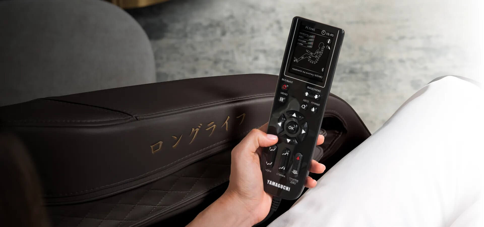 Максимально простой и интуитивно понятный интерфейс пульта превращает процесс управления креслом в настоящее удовольствие.