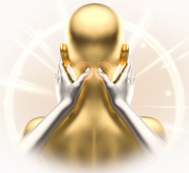 Массажные ролики движутся вниз по затылочному треугольнику и касаются точек здоровья Фэн-чи в нижней части черепа.