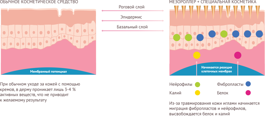 Эффективное колющее воздействие на кожный покров стимулирует микроциркуляцию крови, восстанавливает ослабевшие волокна соединительной ткани, которые содержат коллаген и эластин. Покалывания различной степени раздражают клетки дермы, активизируя их деятельность. Таким образом, прибор инициирует внутренний процесс образования нового коллагена. Воздействуя на кожу лица, валик с иголками обеспечивает лифтинг-эффект, запуская программу естественного омоложения. Процедура мезотерапии предусматривает применение лечебных и косметических коктейлей, использование роллера усиливает в несколько раз действие этих препаратов.