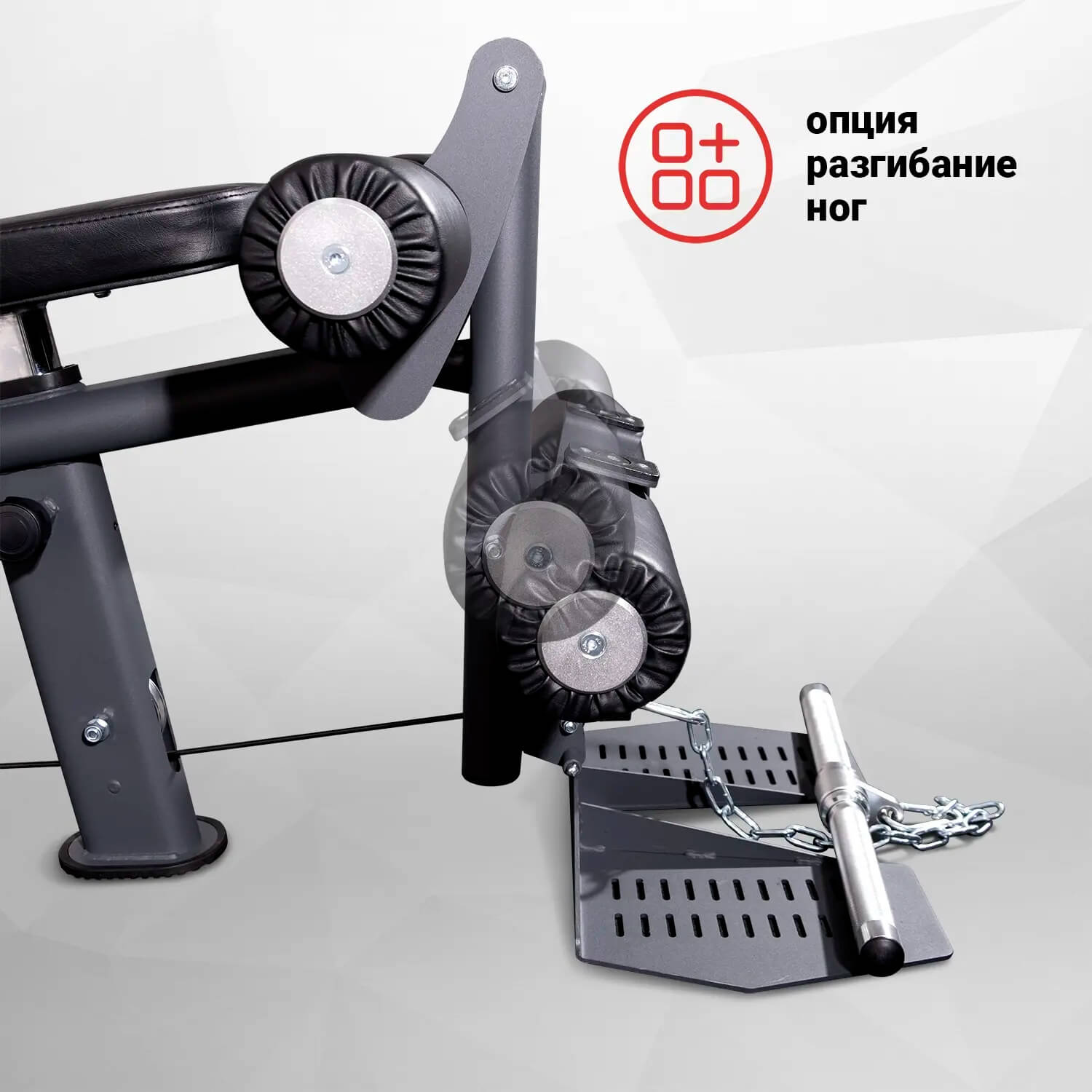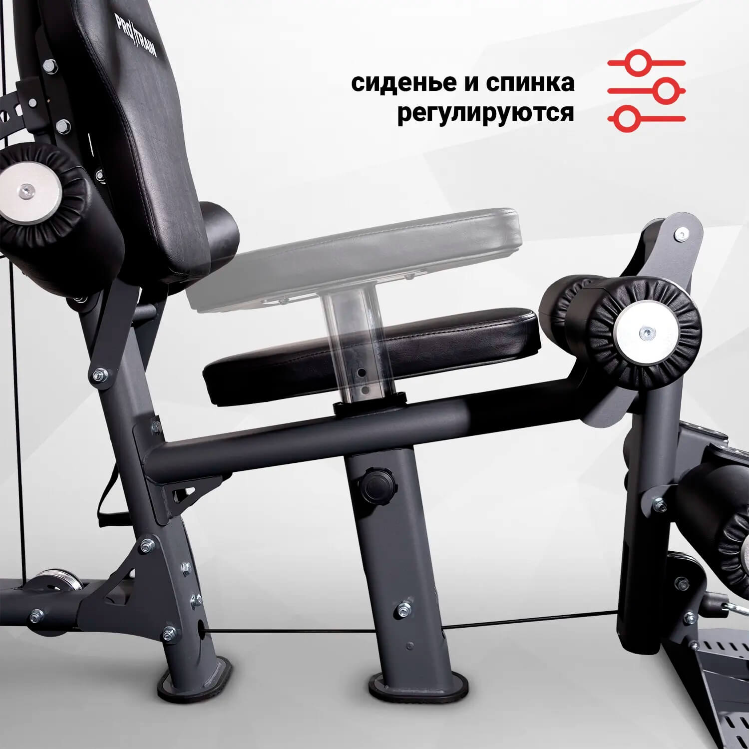 Сиденье, валики, спинка и подлокотники регулируются. Спортсмен может принять максимально комфортное положение и смещать нагрузку на разные группы мышц.