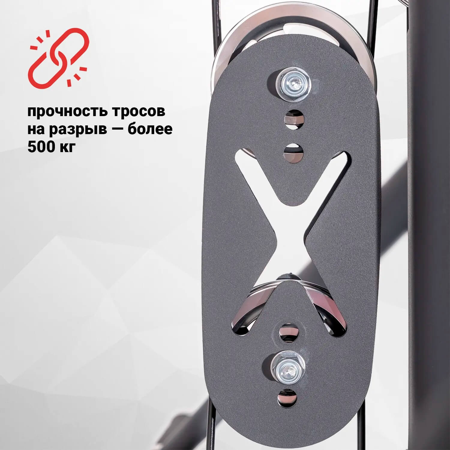 Рама выполнена из сверхпрочной стали, шкивы — из нейлона. Прочность на разрыв используемых тросов — более 500 килограммов. Опоры рычагов оснащены шариковыми подшипниками с плавным и тихим ходом.