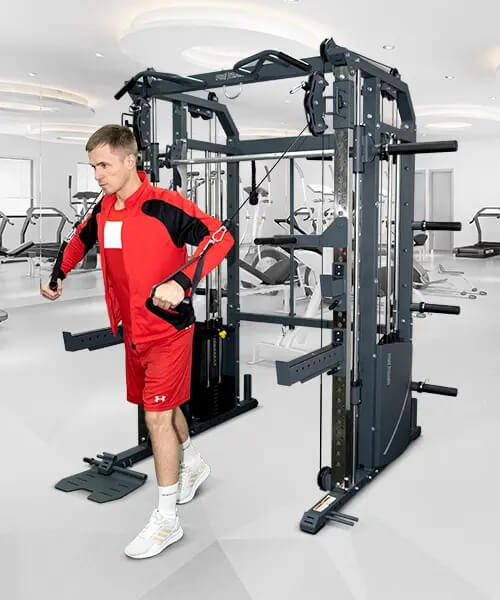 Сочетает в себе: машину Смита, кроссовер, стойки для приседаний и жимов, силовую раму, функциональный тренажер, турник и брусья.