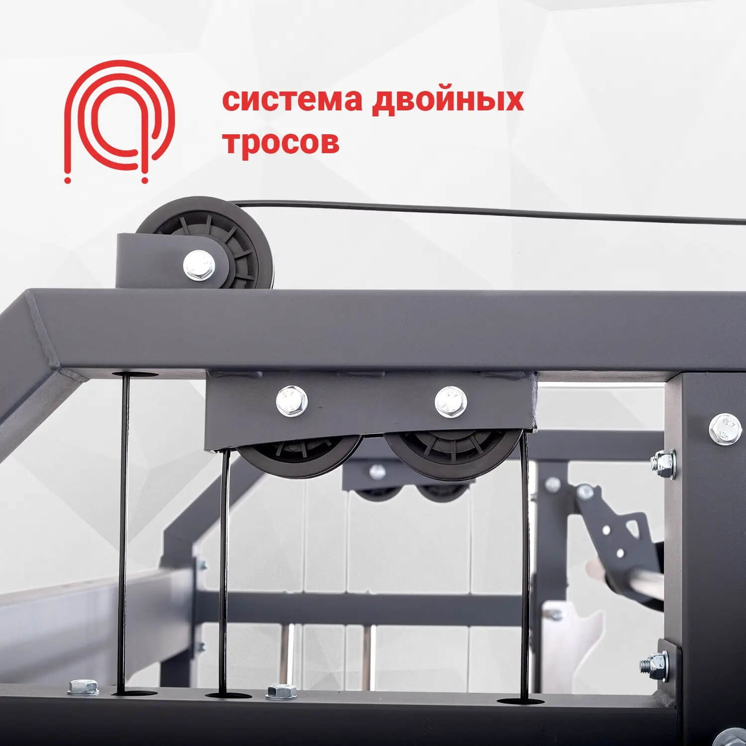 Рама из легированной стали (2 мм) с антикорозийным порошковым покрытием. Нейлоновые шкивы и тросы в оплетке обеспечивают плавный и тихий ход. Комплектующие выполнены из нержавеющей стали. Подшипники промышленного класса.
