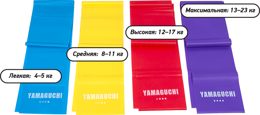 Набор эластичных лент Yamaguchi Fit Band имеет 4 ленты разной степени нагрузки, позволяя регулировать нагрузку во время тренировки Вы равномерно прорабатываете все группы мышц.