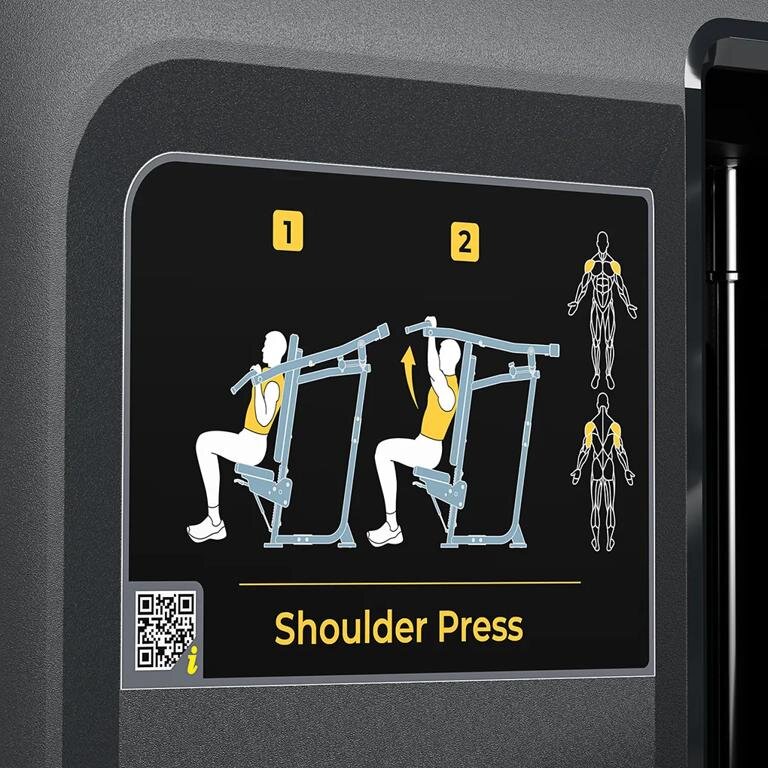 - Инструктивные таблички Обозначения мышц, иллюстрации начала и завершения упражнений, правильные движения на тренажере, QR-код со ссылкой на обучающие видео