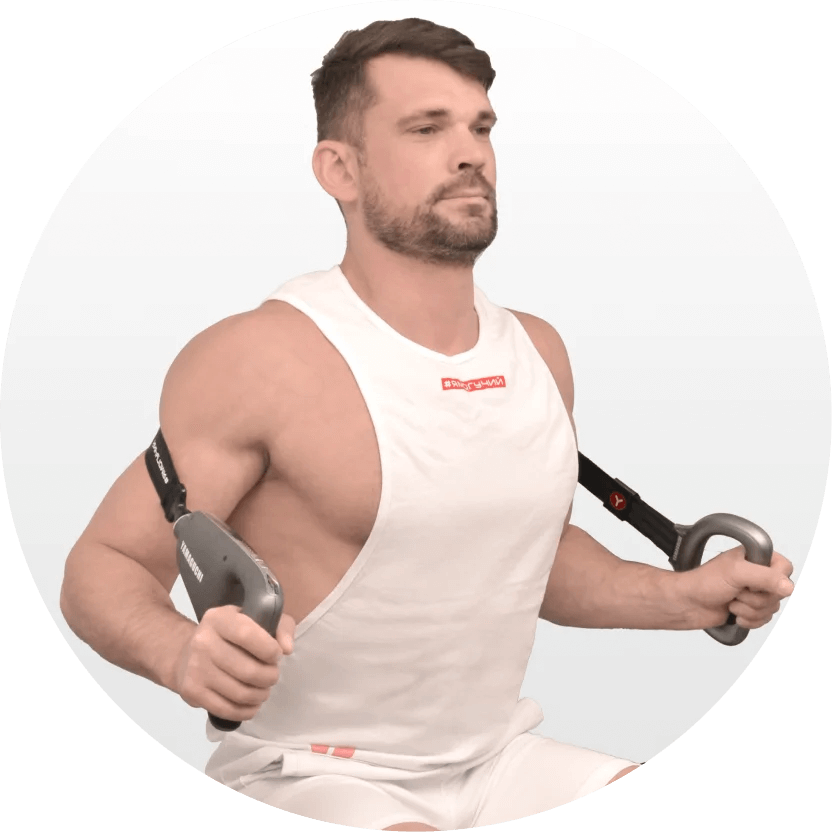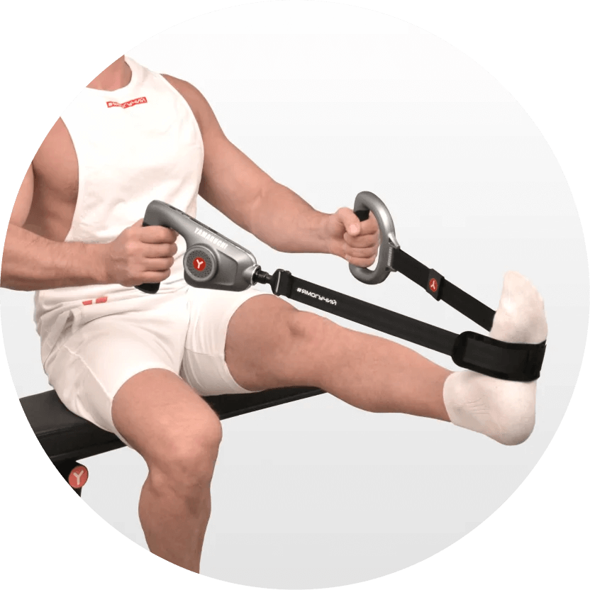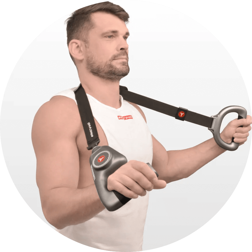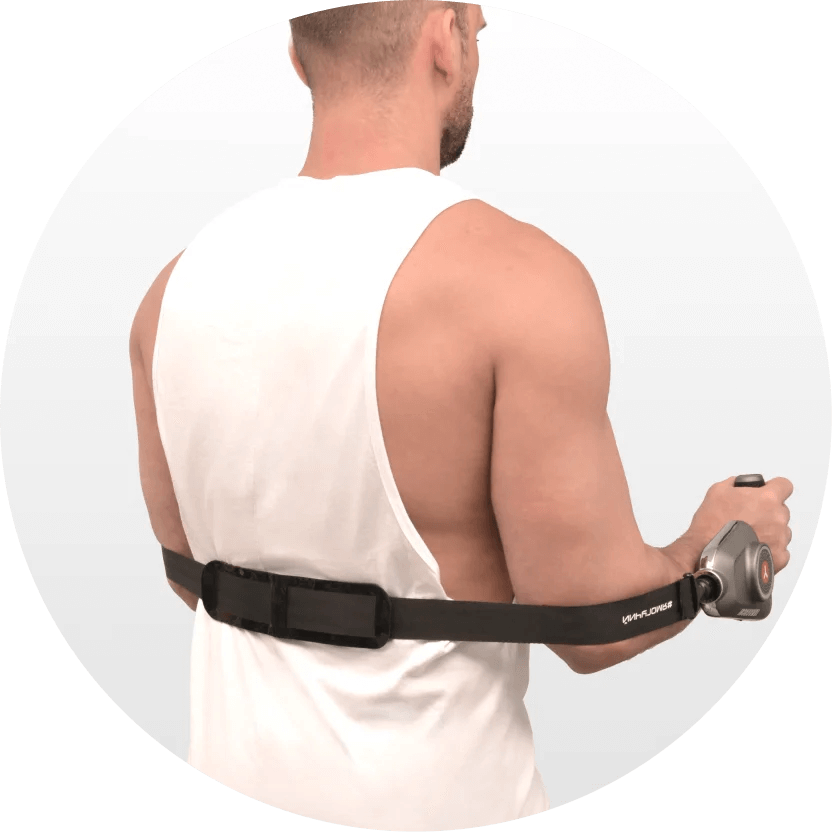 Перкуссор с уникальной насадкой-ремнем для глубокого массажа.