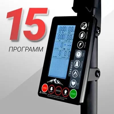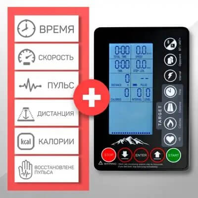 - Показания консоли Время, расстояние, скорость, расход калорий, мощность, частота сердечных сокращений, темп